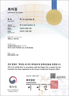 제10-2433990호수소차 예측 대응 수소충전소 운영 관리 시스템(P-210608)수소 인프라 구축에 필요한 핵심 기술의 지식재산권 확보로 제아이엔지는 기술 차별성과 신뢰성을 동시에 갖춘 EPC 전문 기업입니다.