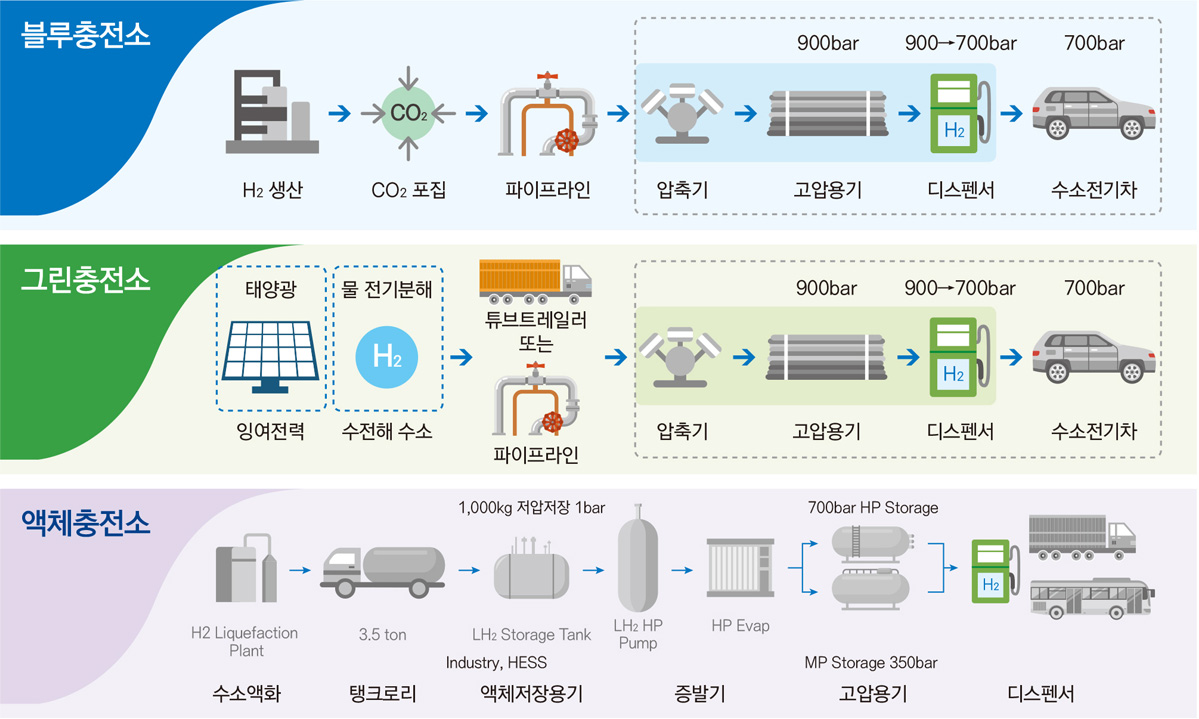 수소 모빌리티에 수소 연료를 재충전하는 장소로, 기존의 자동차 주유소(Gasoline Station)와 유사한 개념입니다. 기존 자동차가 사용하는 휘발유, 경유, LPG 등의 화석연료를 대체하여, 온실가스 배출을 줄이고 탄소중립을 실현할 수 있는 친환경 수소에너지 시대가 열리고 있습니다. 수소충전소는 이러한 변화의 중심에 있는 미래형 청정에너지 공급시설로서, 빠르게 성장하는 수소 모빌리티 시장에서 수소를 안전하고 신속하게 공급하여 지속가능한 친환경 교통체계를 실현하는 핵심 인프라입니다.